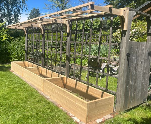 A yard of soil weights over 1000lbs. Wet, that weight can exceed 2700lbs, pushing on the sides of the box. Even those small boxes can have over 300lbs pushing on the sides when the soil is wet. My boxes are made with minimum inch and half thick timbers. Joined with hidden joinery using Blue Kote screws that are 400% more corrosive resistant than normal outdoor screws. Only using normal outdoor screws and/or lag bolts for deer fencing, gates and pergola top installations.